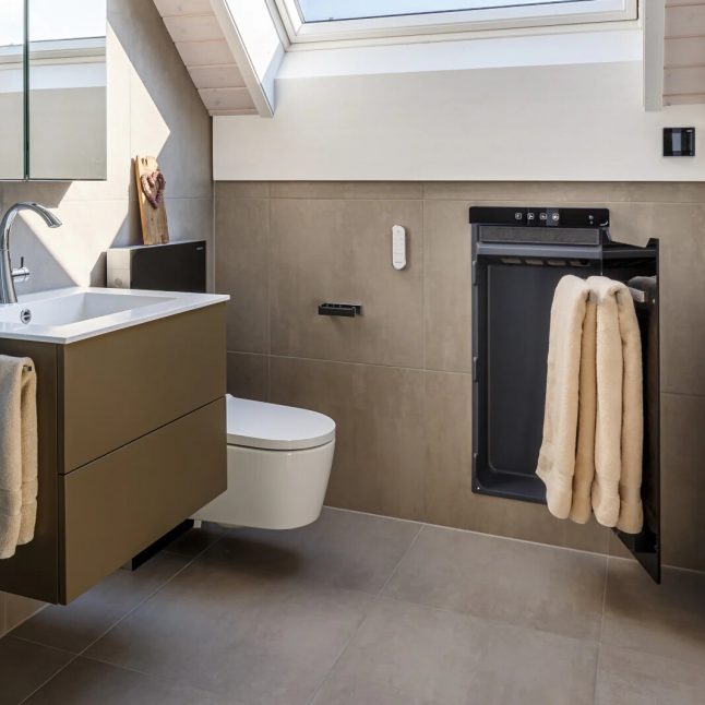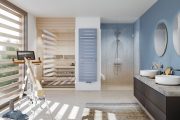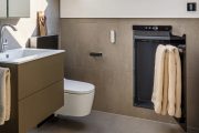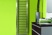 Lakovaný koupelnový radiátor Zehnder Metropolitan Bar lze barevně dokonale sladit s interiérem koupelny. Je určen pro elektrický provoz. Foto Zehnder