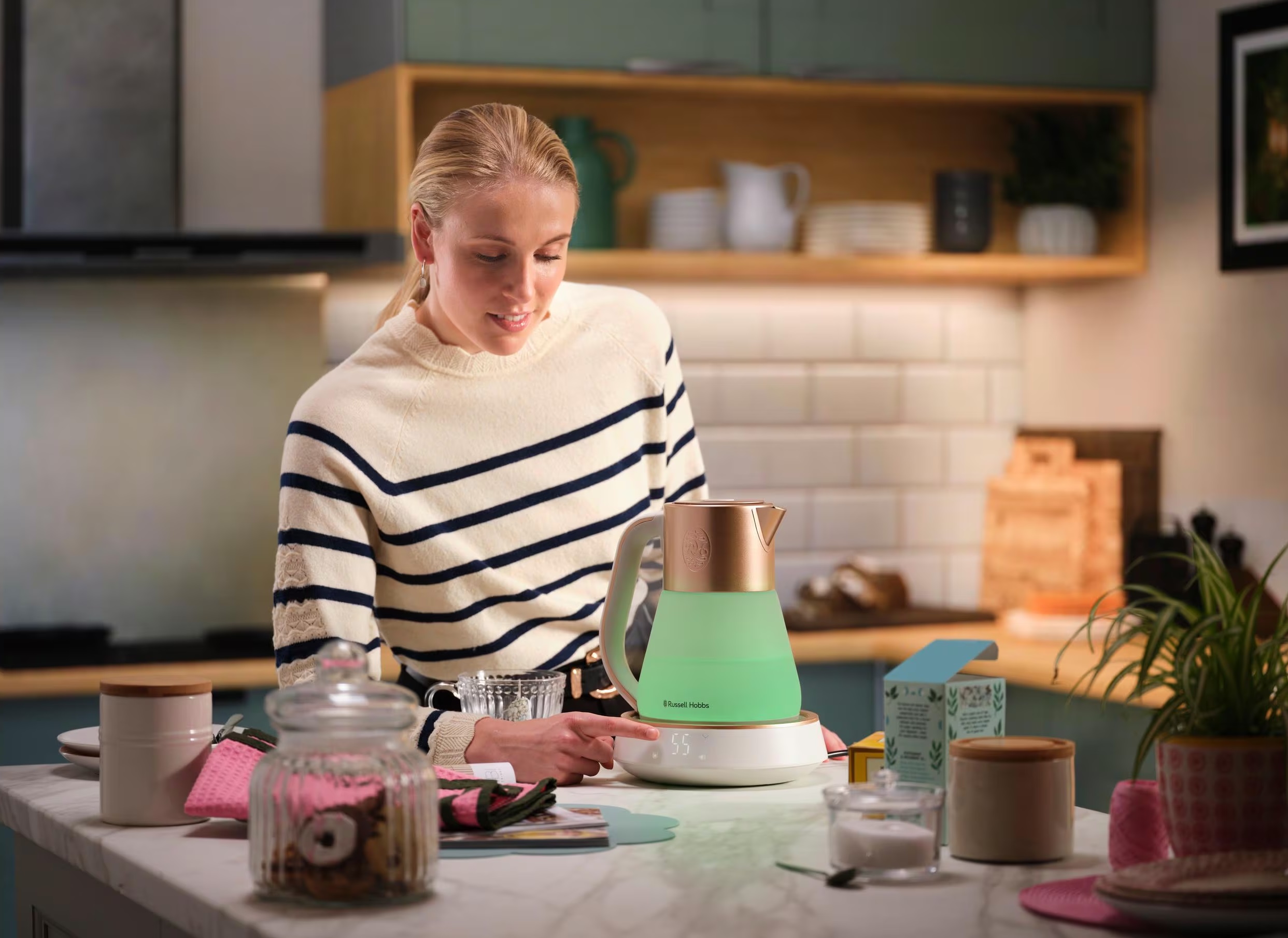 Rychlovarná konvice Russel Hobs Calm s objemem 1,7 l, omyvatelným filtrem, digitálním ukazatelem teploty a barevným podsvícením umožňuje regulaci teploty. 3 299 Kč, Datart