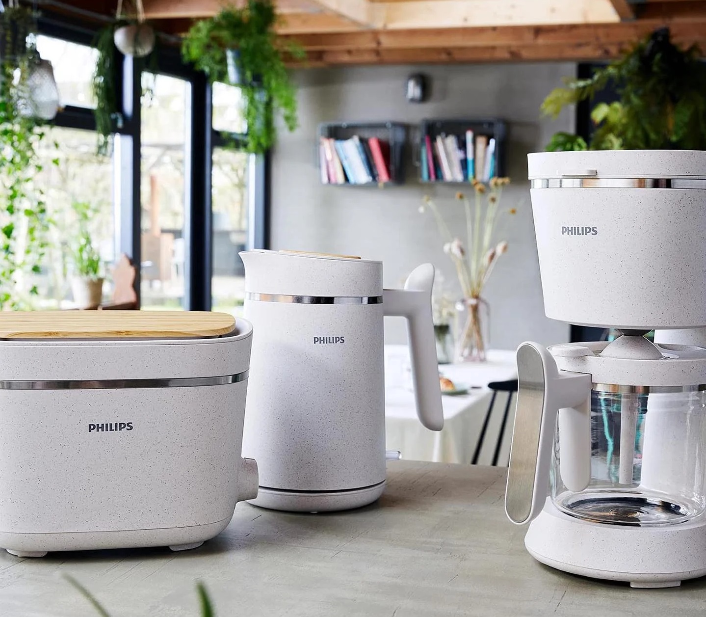 Série spotřebičů Philips Eco Conscious Edition nabízí rychlovarnou konvici, kávovar i topinkovač, které šetří vodu i energii a jsou vyrobeny z odolného a zdravotně nezávadného 100% bioplastu. Od 1 499 Kč, Datart