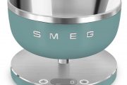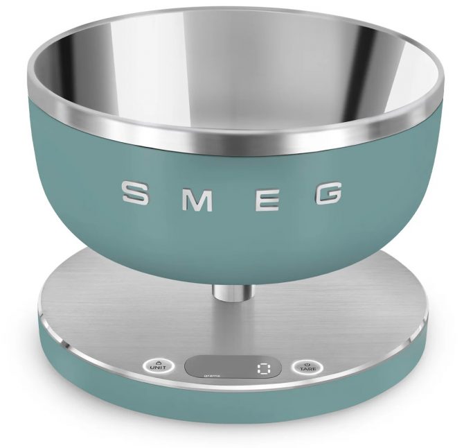 Bleděmodrá váha značky Smeg má digitální displej, funkci tárování a možnost měnit měrné jednotky. 3 519 Kč, Formadore