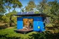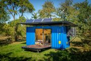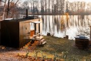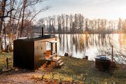 Komfort s pokorou k přírodě – to je mobilní obytný kontejner Kebin. Plocha jen 15 m2, na střeše fotovoltaika a světlík pro koupelnu, zastřešená teráska. Opodál finská lázeň. Foto: Tino Kuskunis. Foto Kebin