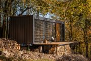 Na kraji lesa postavil své skromné útočiště Marek Popálený. Původně letecký inženýr je dnes průkopníkem kontejnerové architektury. Bohaté prosklení jižní strany. Foto RI okna