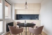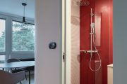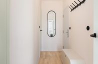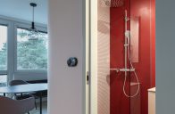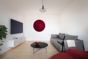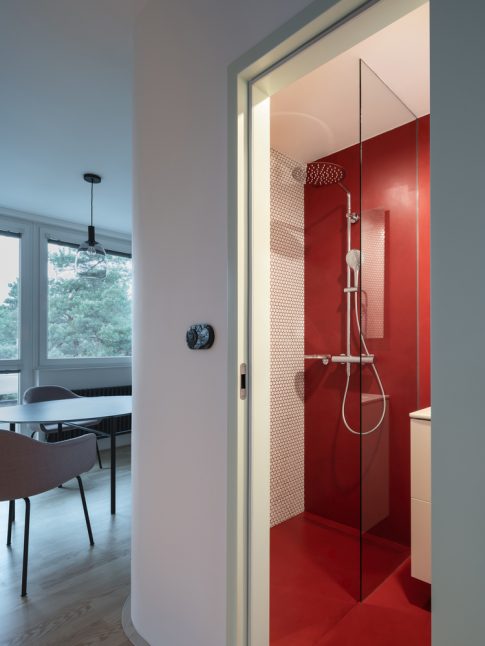 Rekonstrukce spočívala v drobných dispozičních úpravách, plynulém propojení prostoru a vybudování nového hygienického zázemí. Díky zaoblení rohů a odstranění dveří mezi obývákem a kuchyní je byt otevřenější, vlídný a pobytově příjemný. Celý prostor dokonale sjednocují bílé omítky a pochozí podlaha s jemnou kresbou jasanového dřeva. V kontrastu k ní zvolili architekti v koupelně a na WC jednolitou výraznou stěrkovou podlahu v červené barvě.