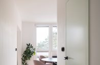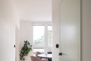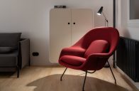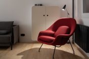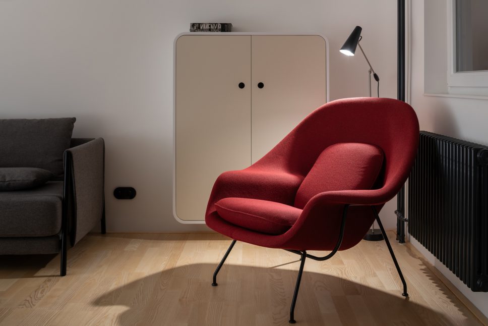 Hru barev doplňují nové jemně zelené dveře, které při otevření dotvářejí zajímavé prolnutí odstínů. Barevné ladění obytného prostoru zvýrazňuje červené ikonické křeslo Womb Chair od finsko-amerického architekta Eera Saarinena. Jeho kovové podnože s černou povrchovou úpravou – stejně jako u dalšího nábytku – kontrastují se světlou jasanovou podlahou.