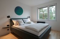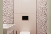 uvádí Tomáš Dvořák, nejstarší z autorského týmu. „Kombinace barev a materiálů a zaoblených tvarů jemně rozehrává jinak elementární interiér.“