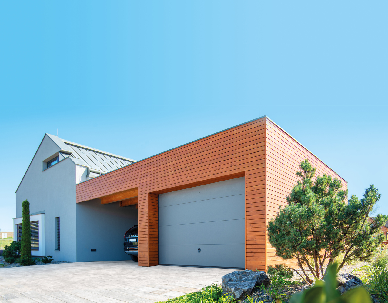 Sekční garážová vrata TRIDO mají odstín elegantně sladěný s fasádou domu. Moderní systém s kvalitním zateplením a dálkovým ovládáním. Foto Trido