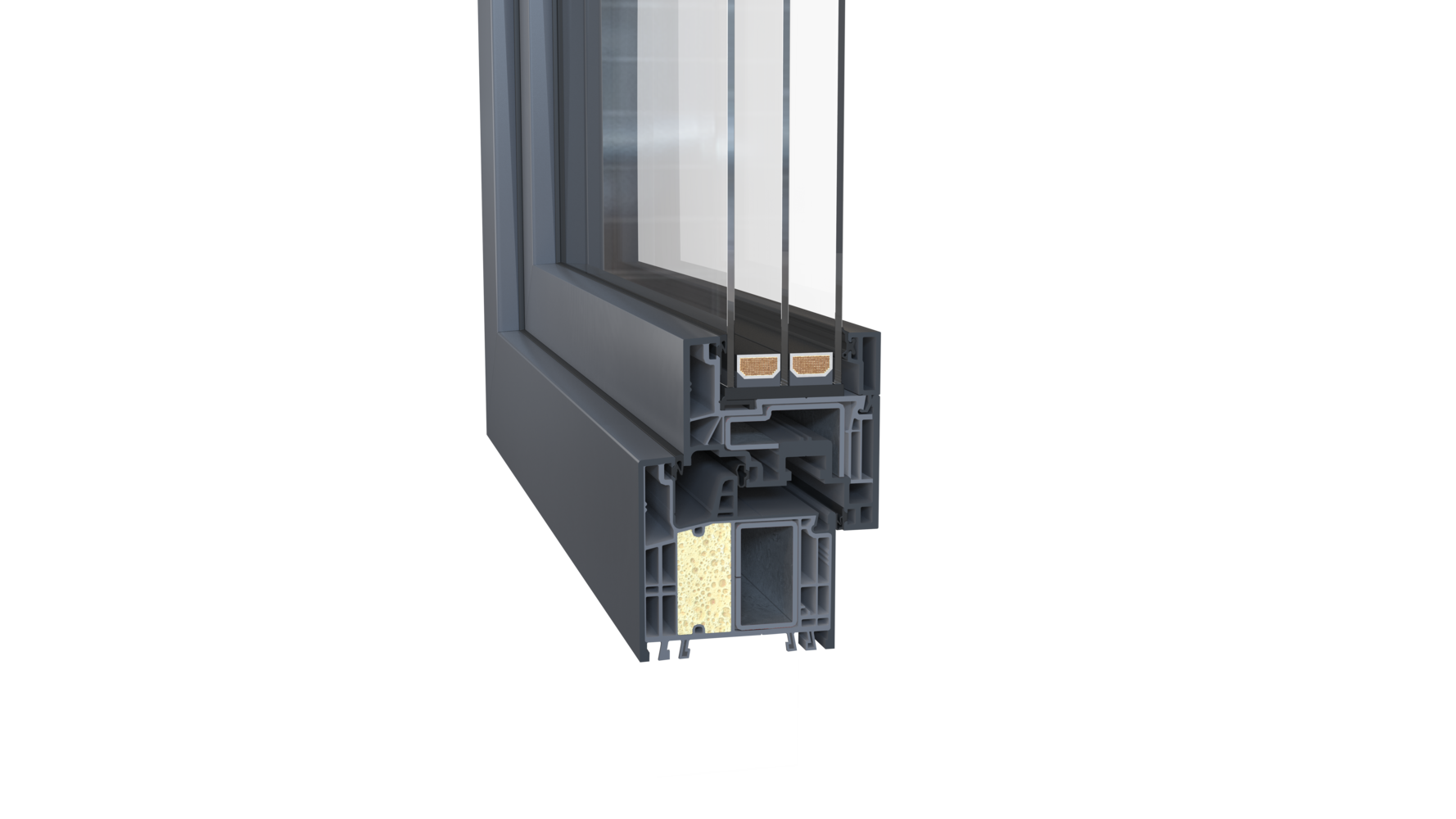 Řez profilem Kontur Plus: stavební hloubka 82,5 mm, rám intenzivně zateplen technologií IKD®, trojsklo IZOS v hluboké zasklívací spáře. Ug = 0,5 W/m2K. Foto Okna Vorlíček