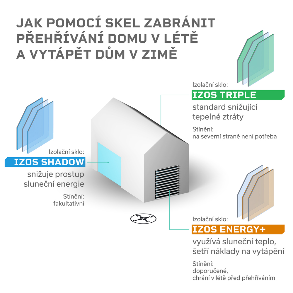 Schopnost tepelné izolace zasklení je charakterizována součinitelem prostupu tepla sklem (Ug): Čím je jeho hodnota nižší, tím lépe zasklení izoluje. Možnosti současných izolačních skel se nejvíce projevují při srovnání s dvojsklem využívaným na přelomu tisíciletí. V jeho případě se Ug pohybuje kolem 1,6 W/m2K, zatímco například trojsklo IZOS Energy+ dosahuje výborné hodnoty Ug = 0,5 W/m2K. Kombinuje vrstvené sklo se skly s nízkoemisním pokovením, která jsou vsazena do teplého rámečku s molekulovým sítem, mezera mezi nimi je vyplněna argonem. Při venkovní teplotě -7,5 °C to představuje rozdíl teploty vnitřního skla více než 3 °C, rozdíl v nákladech na vytápění je ale výrazně vyšší – kolem 25 %. Zasklení navíc vykazuje mimořádně vysoký solární faktor (g = až 63 %), tedy schopnost propouštět energii ze slunce. V zimních měsících tak dokáže velmi efektivně snižovat náklady na vytápění. Při vhodné orientaci a dostatečné ploše dokonce zvládne aspoň částečně suplovat fotovoltaické systémy.