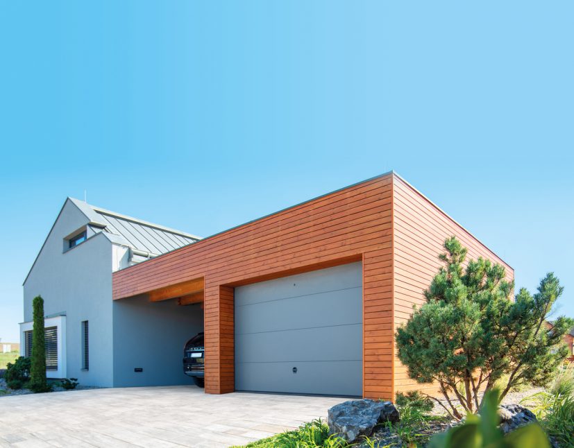 Sekční garážová vrata TRIDO mají odstín elegantně sladěný s fasádou domu. Moderní systém s kvalitním zateplením a dálkovým ovládáním. Foto Trido