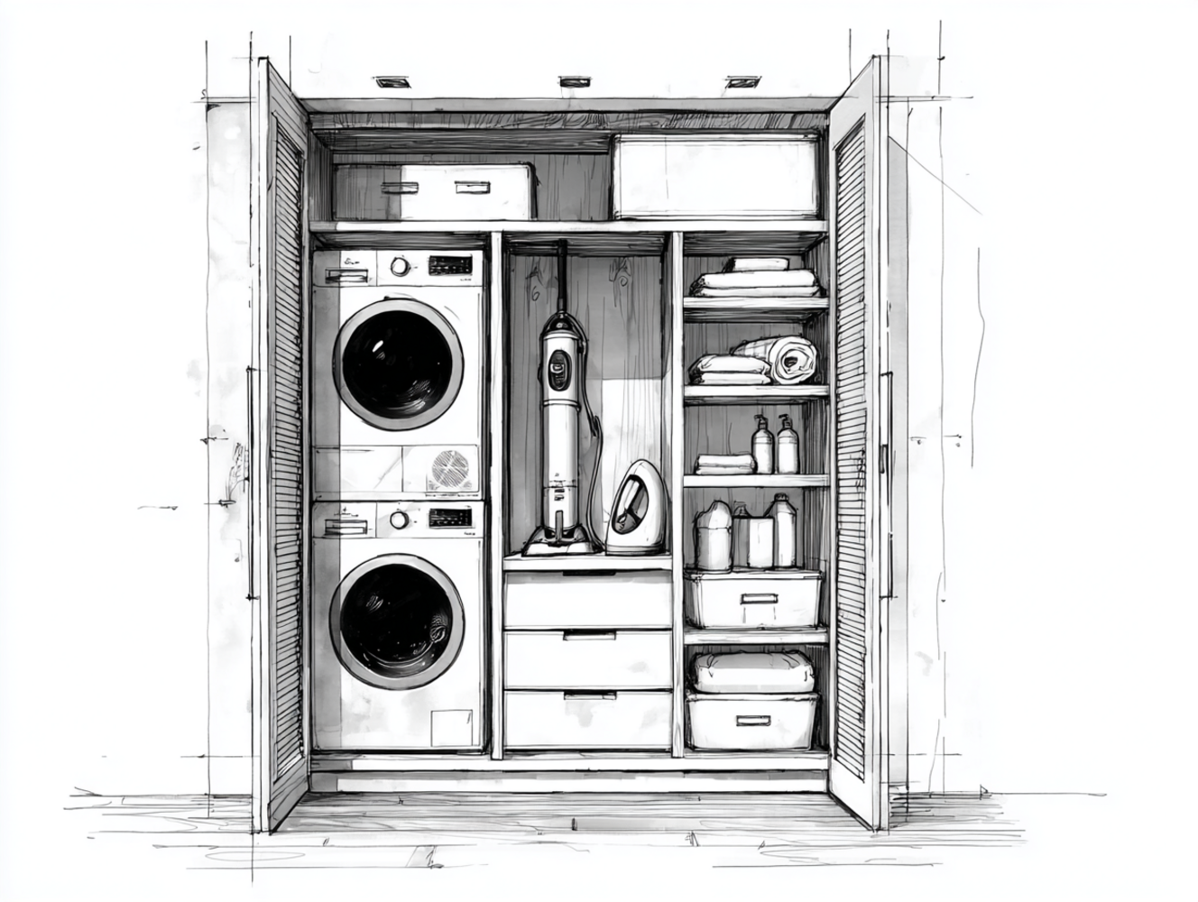 V moderní domácnosti hraje roli nejen praktičnost, ale i vizuální čistota. Vestavná prádelna skrytá za dvířky skříně představuje elegantní řešení, které šetří místo a zároveň působí uspořádaně. Kompaktní věž pračky a sušičky doplňují boxy, zásuvky a výsuvné koše – budete tak mít po ruce všechny prací prostředky, ručníky, žehličku a klidně zde můžete uložit i další domácí pomocníky.