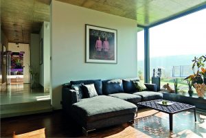 Polštáře pohovky plněné peřím nabízejí pohodlné posezení.