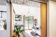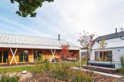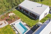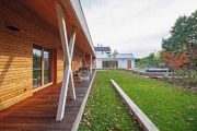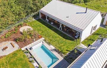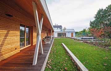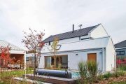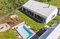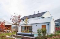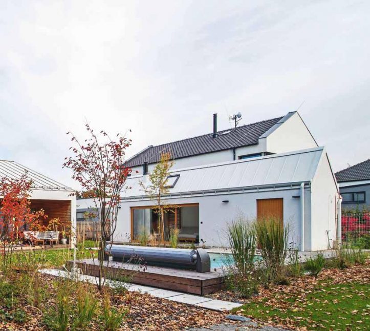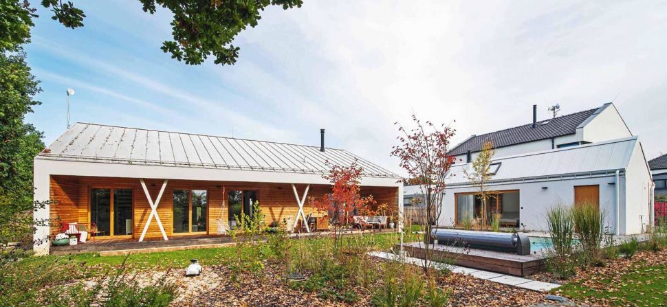 Promyšlené rozvržení domu a zahradního domku vytváří klidné a chráněné zákoutí s bazénem. Dům pro čtyřčlennou rodinu navrhli architekti jako přízemní s asymetrickou střechou a přehlednou dispozicí. Směrem do ulice je jeho fasáda poměrně strohá. Část obrácená do zahrady je ale obložena sibiřským modřínem a otevírá se širokou terasou se dvěma páry sloupů, která je chráněná přetaženou střechou a přístupná přímo z obytných místností. Společenskou část tvoří velká místnost zahrnující kuchyni, jídelní a obývací kout s velkou knihovnou, pohovkou a krbovými kamny. Vedle ní je pracovna, která slouží i jako příležitostný pokoj pro hosty, dále dva stejně velké dětské pokoje, ložnice rodičů, WC a koupelna.