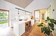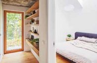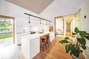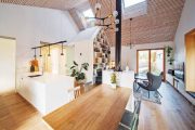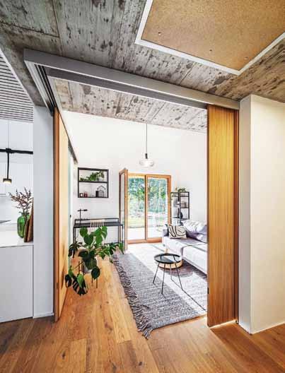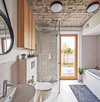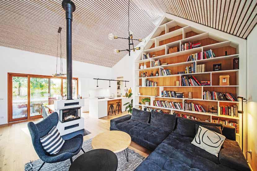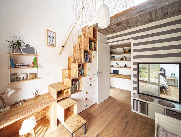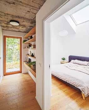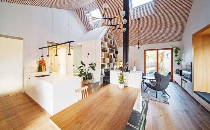 „ Spolupráce s klienty byla od začátku příjemná, tvořivá a přinesla výsledek, z nějž mají všichni zúčastnění radost. Snažili jsme se, aby materiály i barevné ladění do světlých tónů v kombinaci s dubovou dýhou nebo pohledovým betonem působily harmonicky. Nábytek na míru a prakticky řešené úložné prostory tu kromě svého primárního účelu slouží i jako výrazná dominanta interiéru (vysoká knihovna v obýváku) nebo jako jeho hravá součást (schody v dětském pokoji).“
