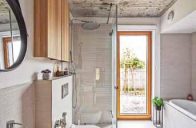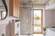 Jasnou a přímočarou koncepci domu dotvářejí i použité materiály. V interiéru s dubovými podlahami se nejčastěji vyskytuje kombinace bílého lakovaného nábytku, dubové dýhy nebo masivního dřeva, které na stropech doplňuje přiznaný pohledový beton. Podlahu koupelny pokrývá světlá dlažba, stěny chrání obklad s reliéfním drážkovaným povrchem.