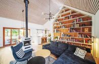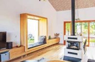 Téměř veškerý nábytek byl vyroben na míru. Dominantou obývacího pokoje se stala originální knihovna sahající až do stropu. Strop obývacího pokoje chrání lamelové podbití z bělených smrkových latí. Kuchyňská linka je vyrobena z bíle lakované MDF. Uprostřed místnosti stojí krbová kamna s trojstranným prosklením, místnost oživuje velké „sedací“ okno s čalouněním a s výhledem do zahrady, zakomponované do obývací stěny. Z obytné místnosti je posuvnými dveřmi oddělena pracovna s pohovkou. Do dětských pokojů navrhli architekti zařízení z borové překližky. Nápaditě vyřešený úložný prostor se zásuvkami a policemi zároveň slouží jako schody na zvýšené patro, využívané na spaní.