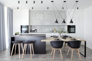 Lineární dispozice kuchyně s volně stojícím pracovním ostrůvkem, na který je napojen jídelní stůl