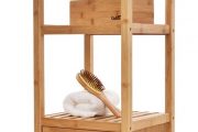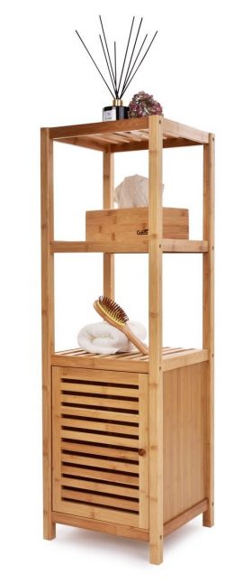 16. Vysoký regál z bambusu o velikosti 36 x 33 x 110 cm rozdělují dvě police a skříňka s dvířky. 2 490 Kč, dedra.cz