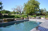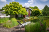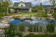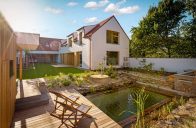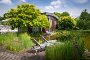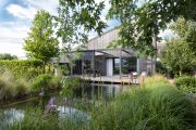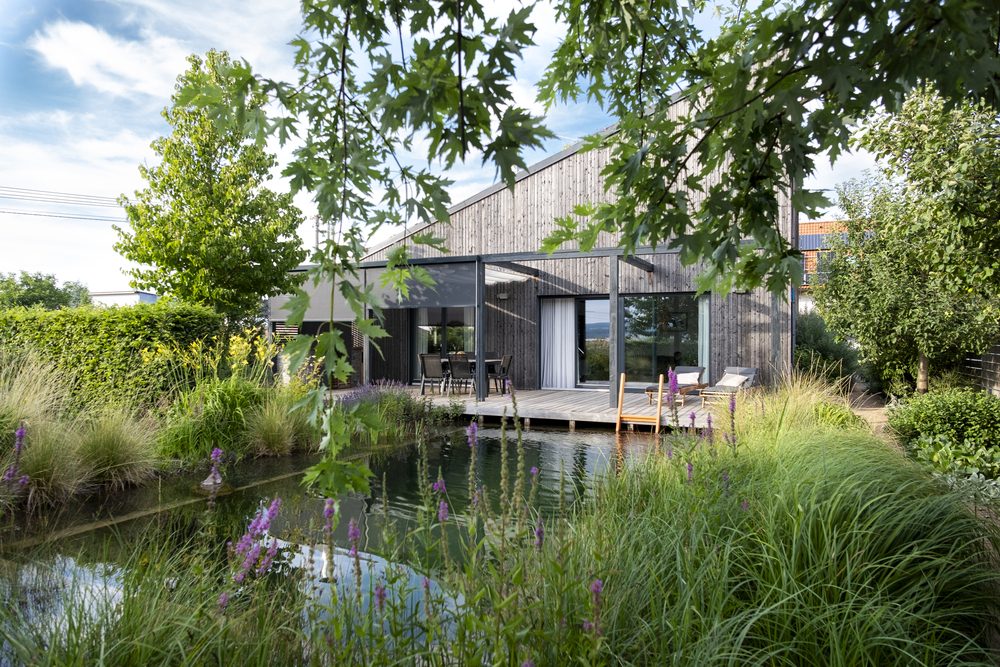 Odvážné řešení u tohoto moderního domu s dřevěnou fasádou představuje koupací jezírko, které zaujímá téměř celou plochu zahrady, rozdělené na čtyři zóny a osázené suchomilnou výsadbou. Dům navazuje na širokou terasu z prken, lemující jezírko z jedné strany. Foto Atelier Flera
