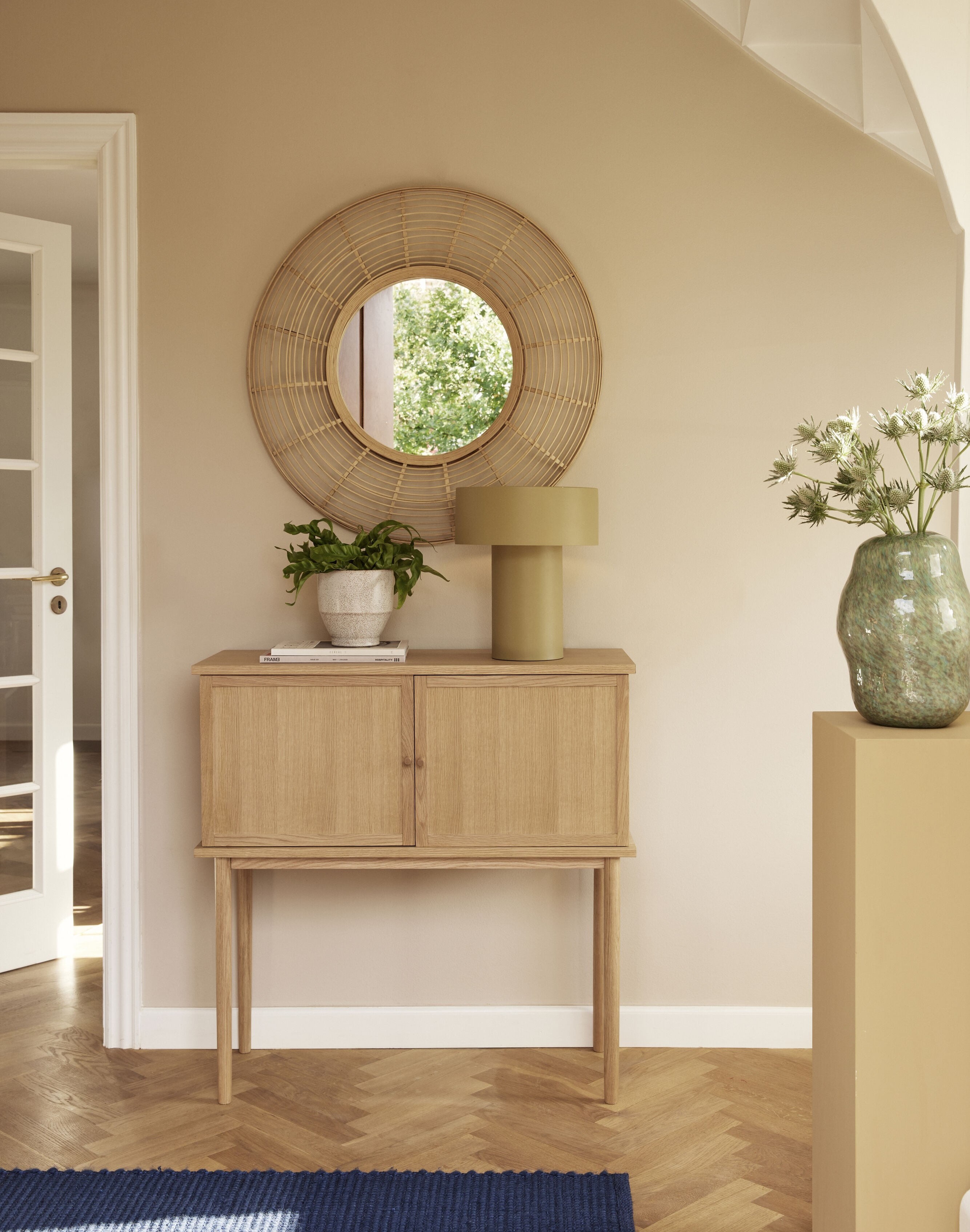 Kulaté zrcadlo IKEA Stockholm v dubovém dýhovaném rámu je dostupné ve dvou šířkách, 60 a 80 cm. 1 690 a 2 290 Kč, IKEA